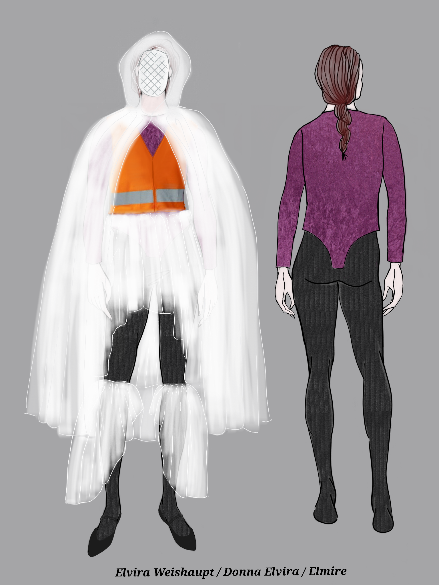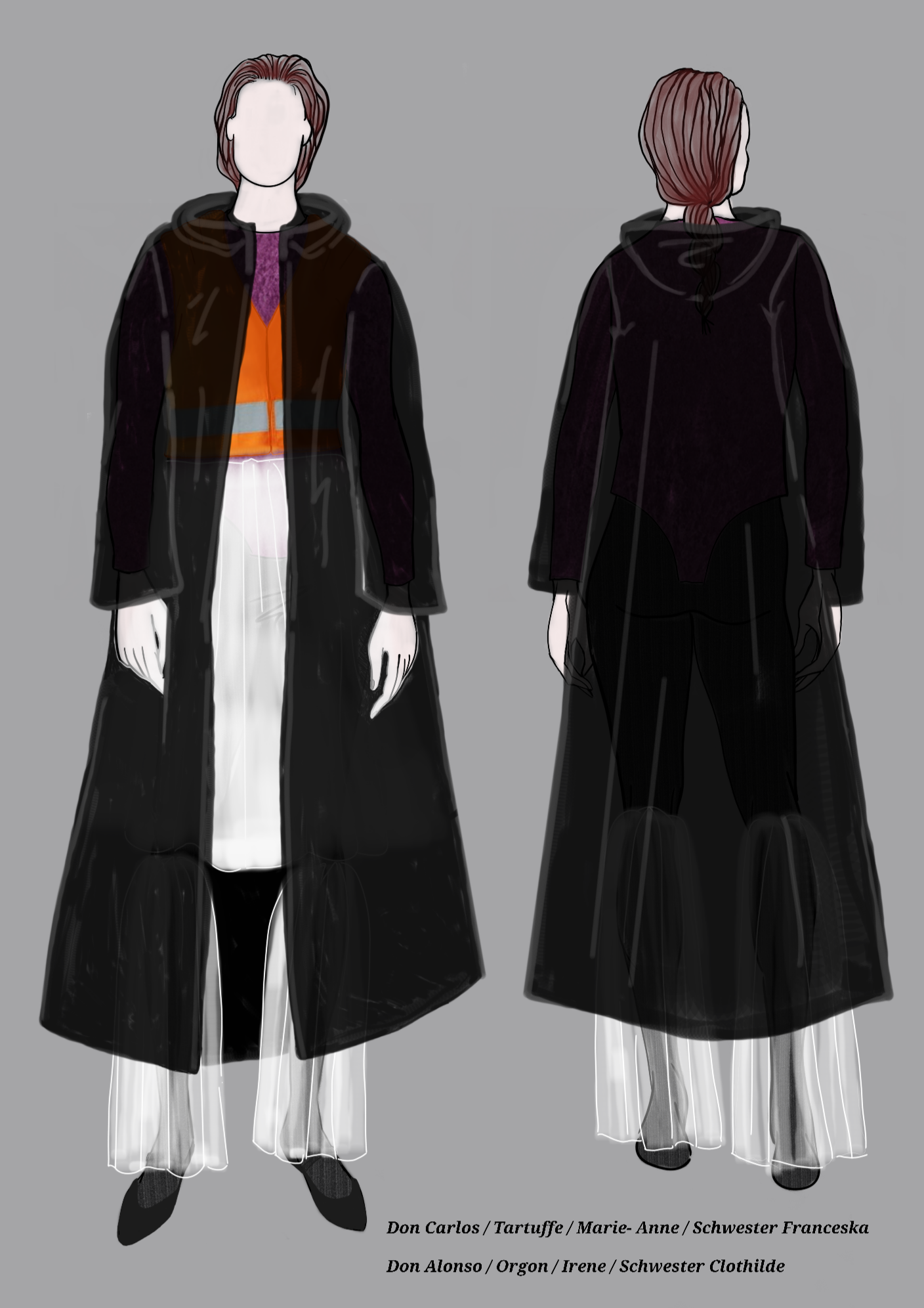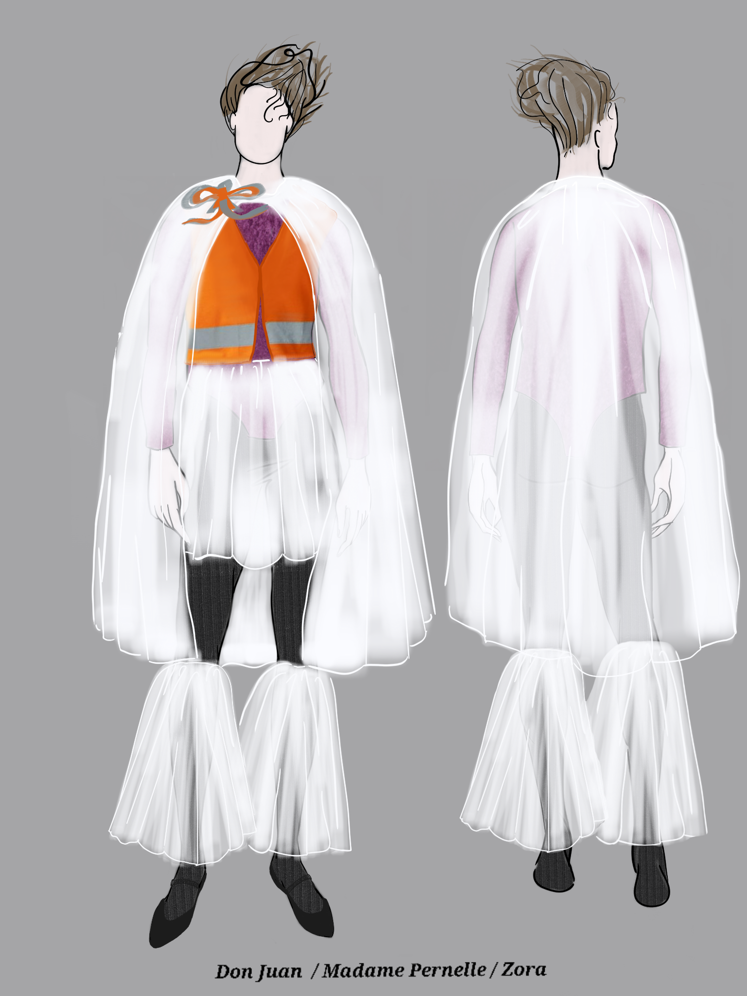 Die barocke Idee des Auflösens antiker Vorbilder, des regel- & formlosen, das ins Unendliche streben-wollen, dient sowohl inhaltlich als auch optisch auf der Bühne als Stilmittel: Eine ins Vibrieren gebrachte Gerade – sich ins digitale Jetzt fortsetzend. Die “Baustelle” als Ort der Auseinandersetzung und des Umgangs mit dem Vorgefundenen – eine bewegte Mischung aus Konservieren und Transformieren – bildet einen Teil des Kostümbildes. Witterungsbeständige Funktionstextilien die mit wallenden, in Falten gelegten Schnitt-Elementen aus dem Barock kontrastiert werden, verhandeln die Rastlosigkeit der (Glaubens-)fragen im Stück auch optisch.