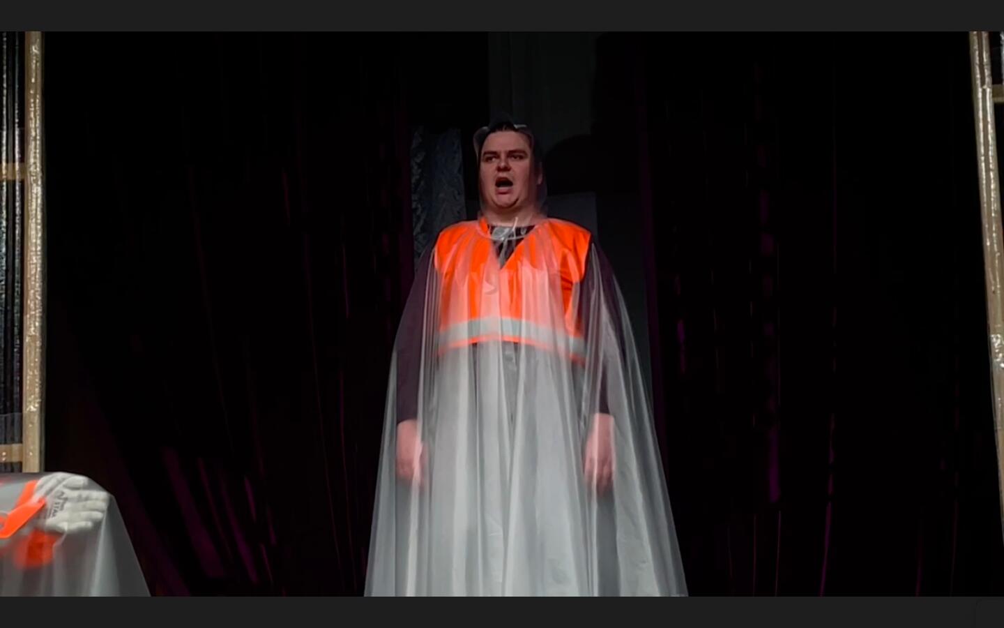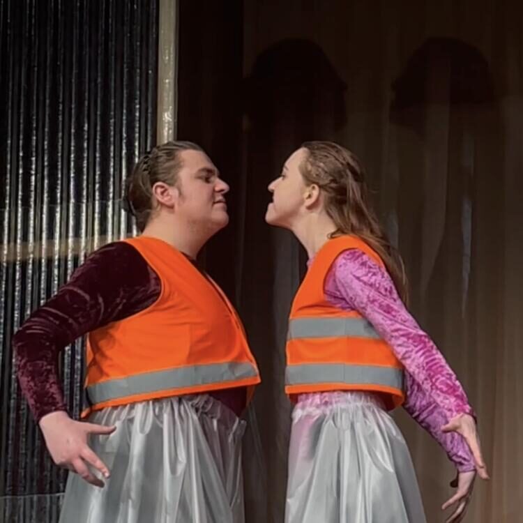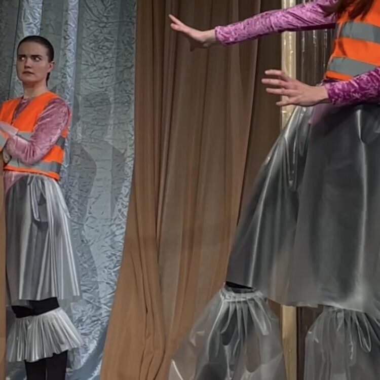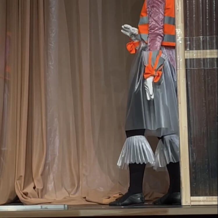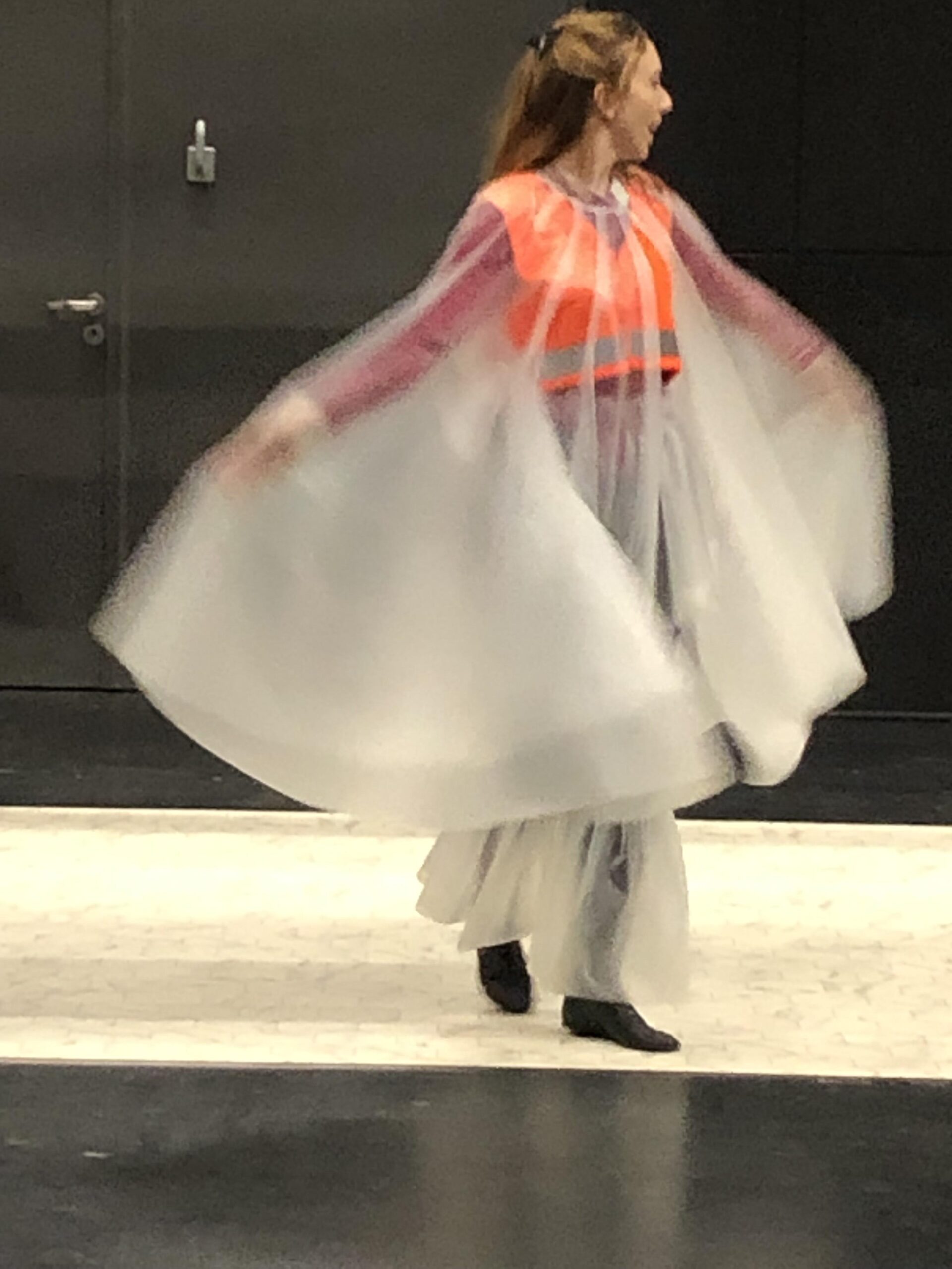 Die barocke Idee des Auflösens antiker Vorbilder, des regel- & formlosen, das ins Unendliche streben-wollen, dient sowohl inhaltlich als auch optisch auf der Bühne als Stilmittel: Eine ins Vibrieren gebrachte Gerade – sich ins digitale Jetzt fortsetzend. Die “Baustelle” als Ort der Auseinandersetzung und des Umgangs mit dem Vorgefundenen – eine bewegte Mischung aus Konservieren und Transformieren – bildet einen Teil des Kostümbildes. Witterungsbeständige Funktionstextilien die mit wallenden, in Falten gelegten Schnitt-Elementen aus dem Barock kontrastiert werden, verhandeln die Rastlosigkeit der (Glaubens-)fragen im Stück auch optisch.