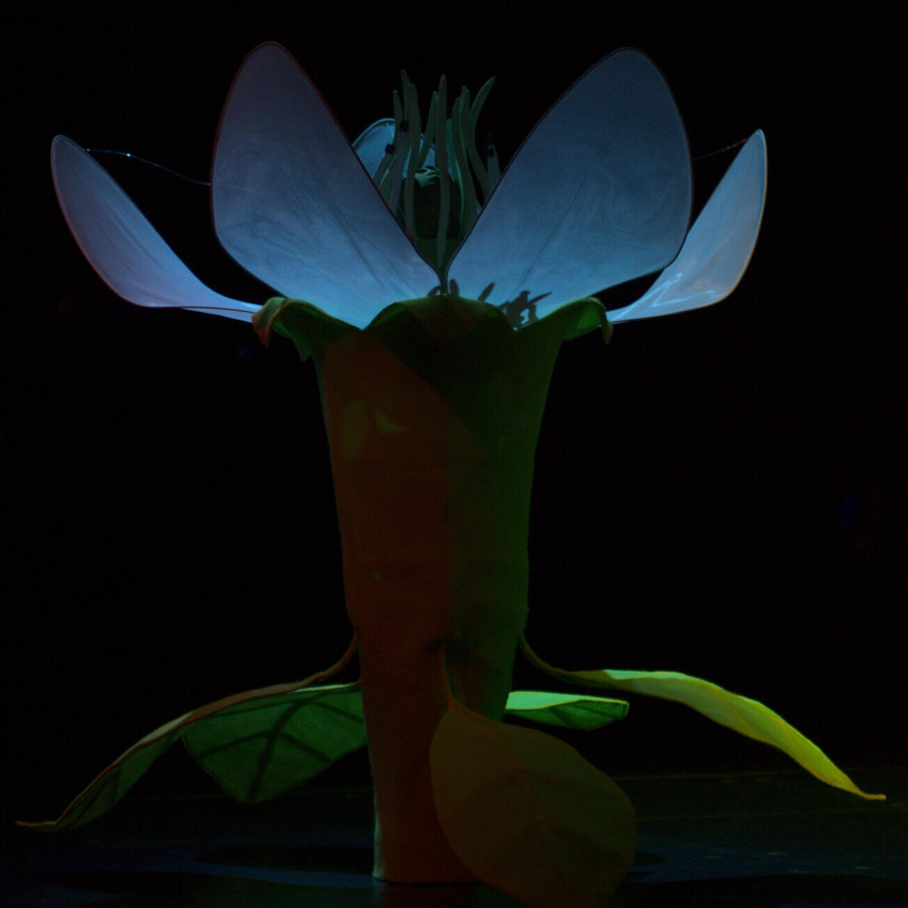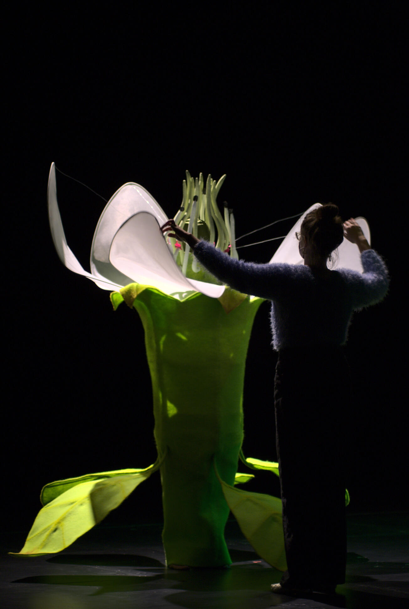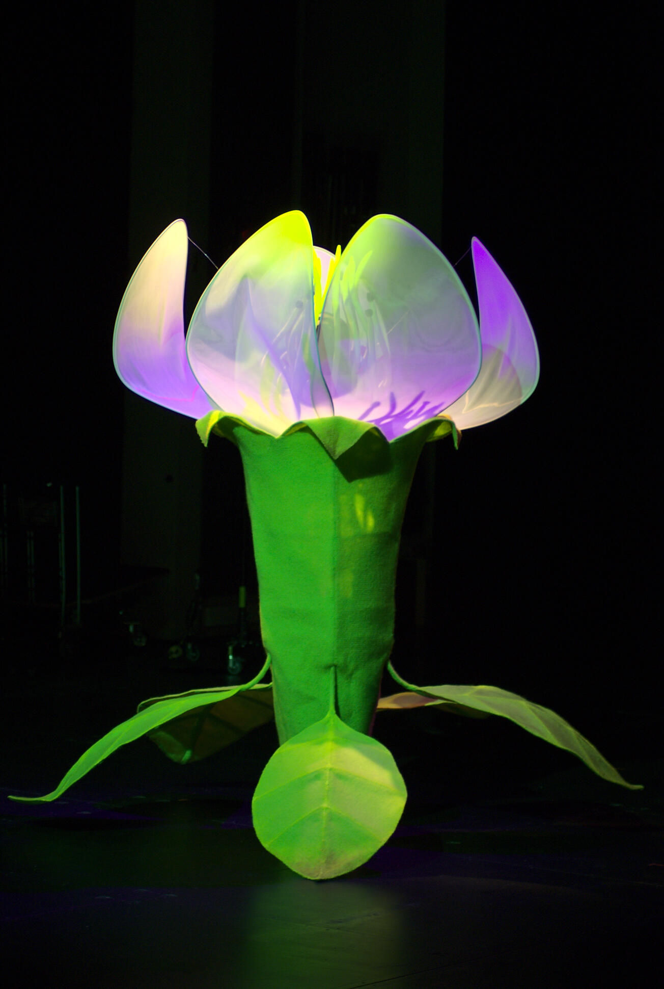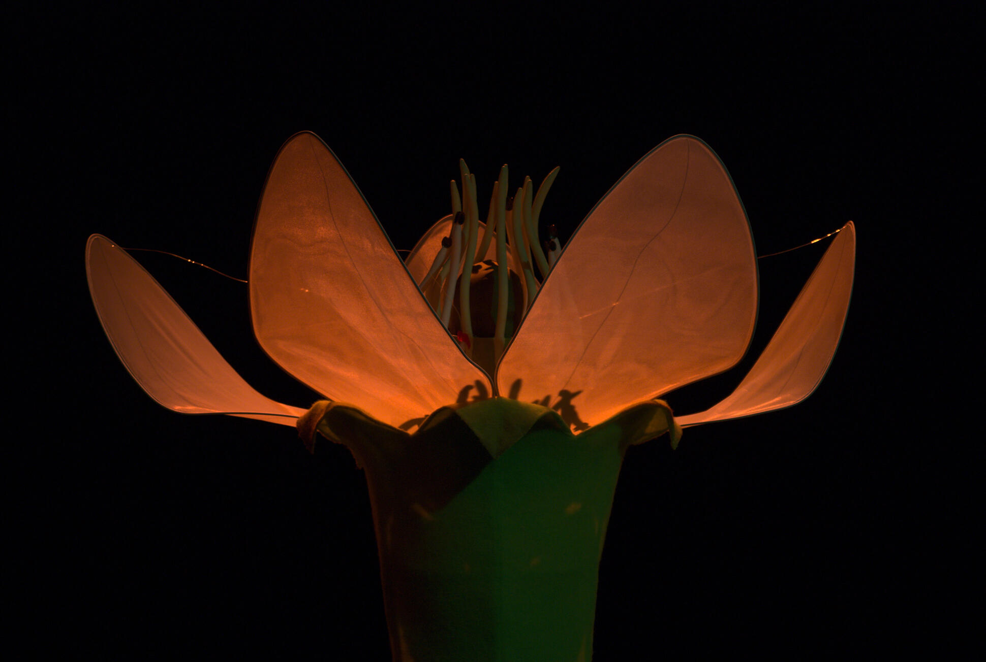 Die Trägerin kann das Kostüm selbst bespielen und einen Mechanismus betätigen durch welchen sich die Blütenblätter öffnen und schließen lassen. Durch die leichte Unterkonstruktion aus Peddigrohr, dass traditionell als Material zum Korbflechten verwendet wird, eignet sich das Kostüm als Walking Act, kann aber auch einfach als tragbare Skulptur wirken.